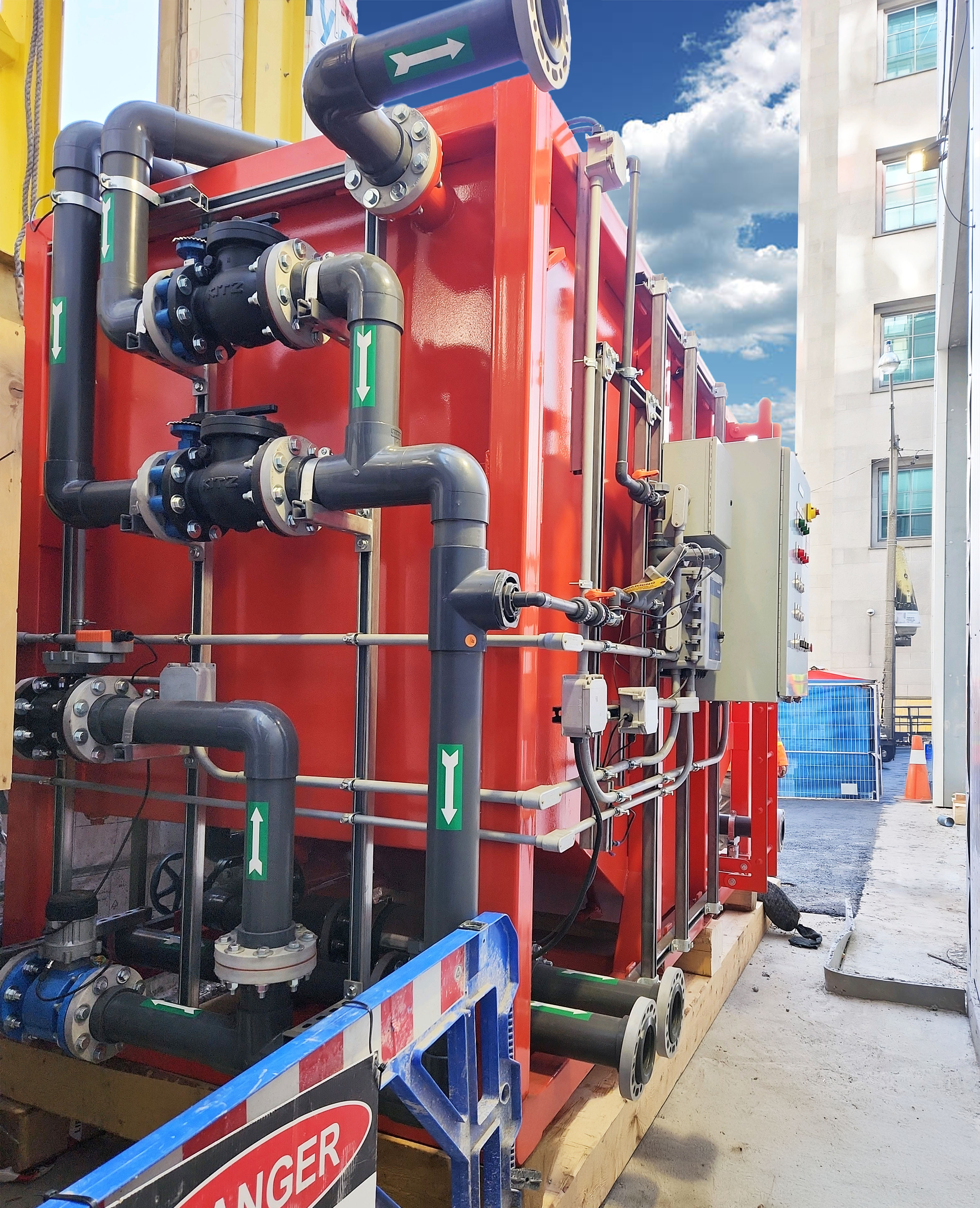 Each unit was engineered to handle up to 10,000 mg/L TSS and discharge into sanitary or combined sewer under Toronto Municipal Code Chapter 681 (Table 1 – pH and TSS requirements), utilizing magnetic flowmeters with automated valves, chemical dosing systems, lamella clarifier, sludge and discharge pumping, and a PLC/SCADA platform with remote access and real-time data visualization. Housed within fully insulated ISO containers, these systems were built for long-term outdoor reliability.